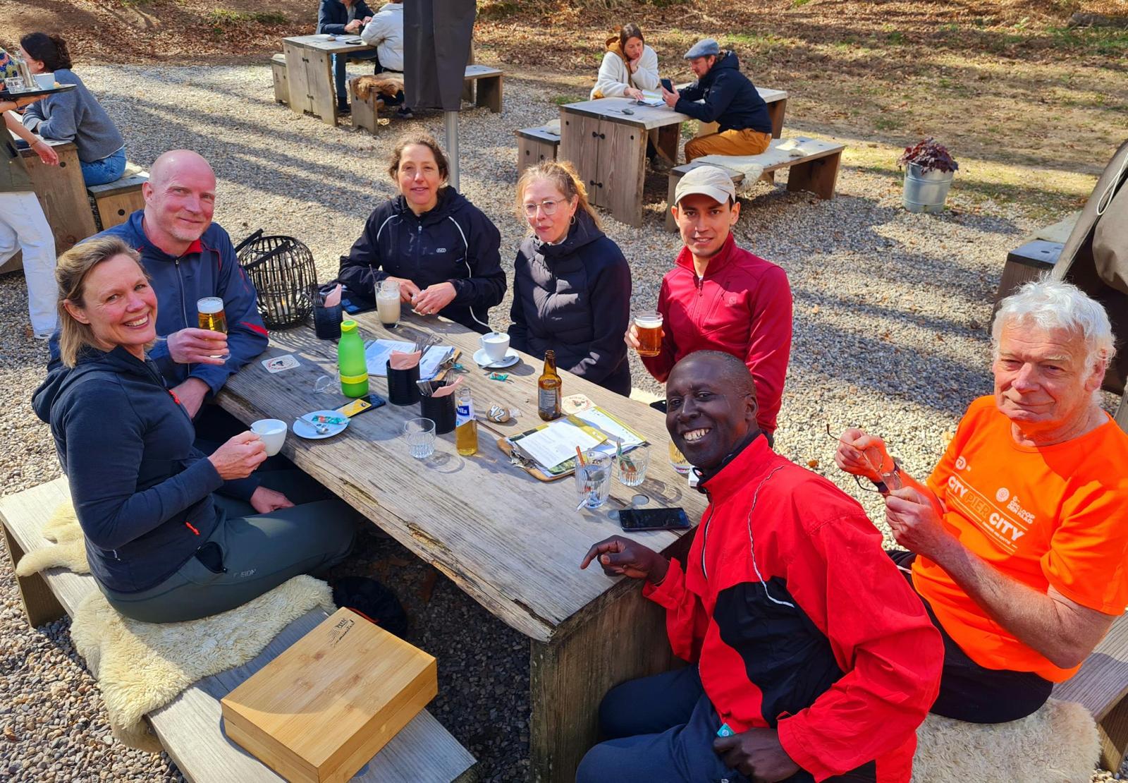Vlakbij Velp eindigden we bij een bosrestaurant. Even de spieren rekken en strekken, helaas een teek (jawel, ze zijn er weer!) verwijderen, weer even warme kleding aan, en dan gezamenlijk lunchen, napraten en foto’s delen.